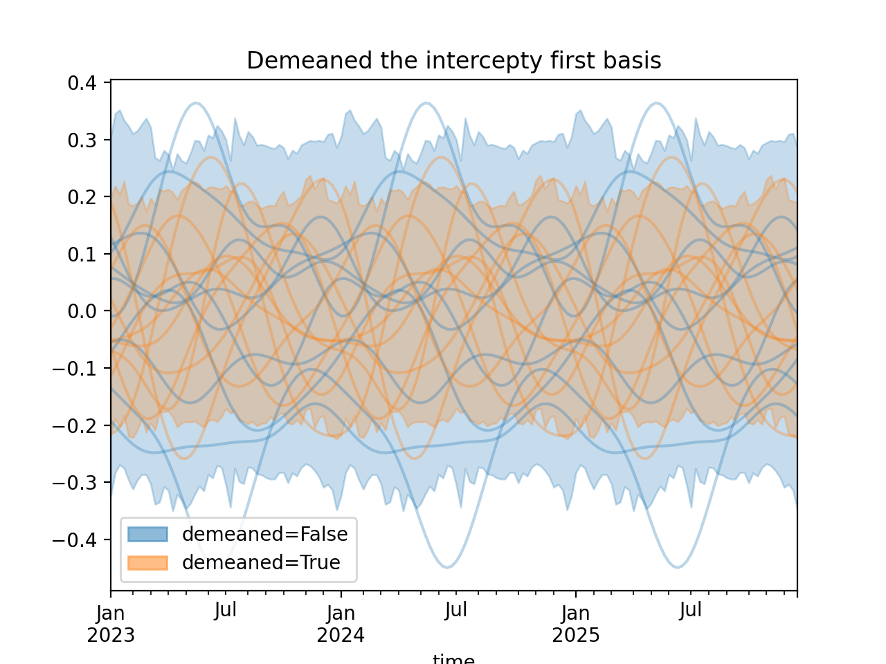 import numpy as np import pandas as pd import xarray as xr import matplotlib.pyplot as plt from pymc_marketing.mmm import HSGPPeriodic from pymc_marketing.plot import plot_curve seed = sum(map(ord, "Periodic GP")) rng = np.random.default_rng(seed) scale = 0.25 ls = 1 kwargs = dict(ls=ls, scale=scale, period=52, cov_func="periodic", dims="time", m=20) n = 52 * 3 dates = pd.date_range("2023-01-01", periods=n, freq="W-MON") X = np.arange(n) coords = {"time": dates} hsgp = HSGPPeriodic(demeaned_basis=False, **kwargs).register_data(X) hsgp_demeaned = HSGPPeriodic(demeaned_basis=True, **kwargs).register_data(X) def sample_curve(hsgp): return hsgp.sample_prior(coords=coords, random_seed=rng)["f"] non_demeaned = sample_curve(hsgp).rename("False") demeaned = sample_curve(hsgp_demeaned).rename("True") combined = xr.merge([non_demeaned, demeaned]).to_array("demeaned") _, axes = combined.pipe(plot_curve, "time", same_axes=True) axes[0].set(title="Demeaned the intercepty first basis") plt.show()