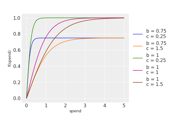 The tanh saturation function has a nice property that is useful when setting priors. The slope of the function when x is zero is \(\frac{1}{c}\). This means that you can set a prior by considering how many units of media are required to acquire the first customer. Unlike most other saturation functions, the slope at 0 is independent of the saturation point.