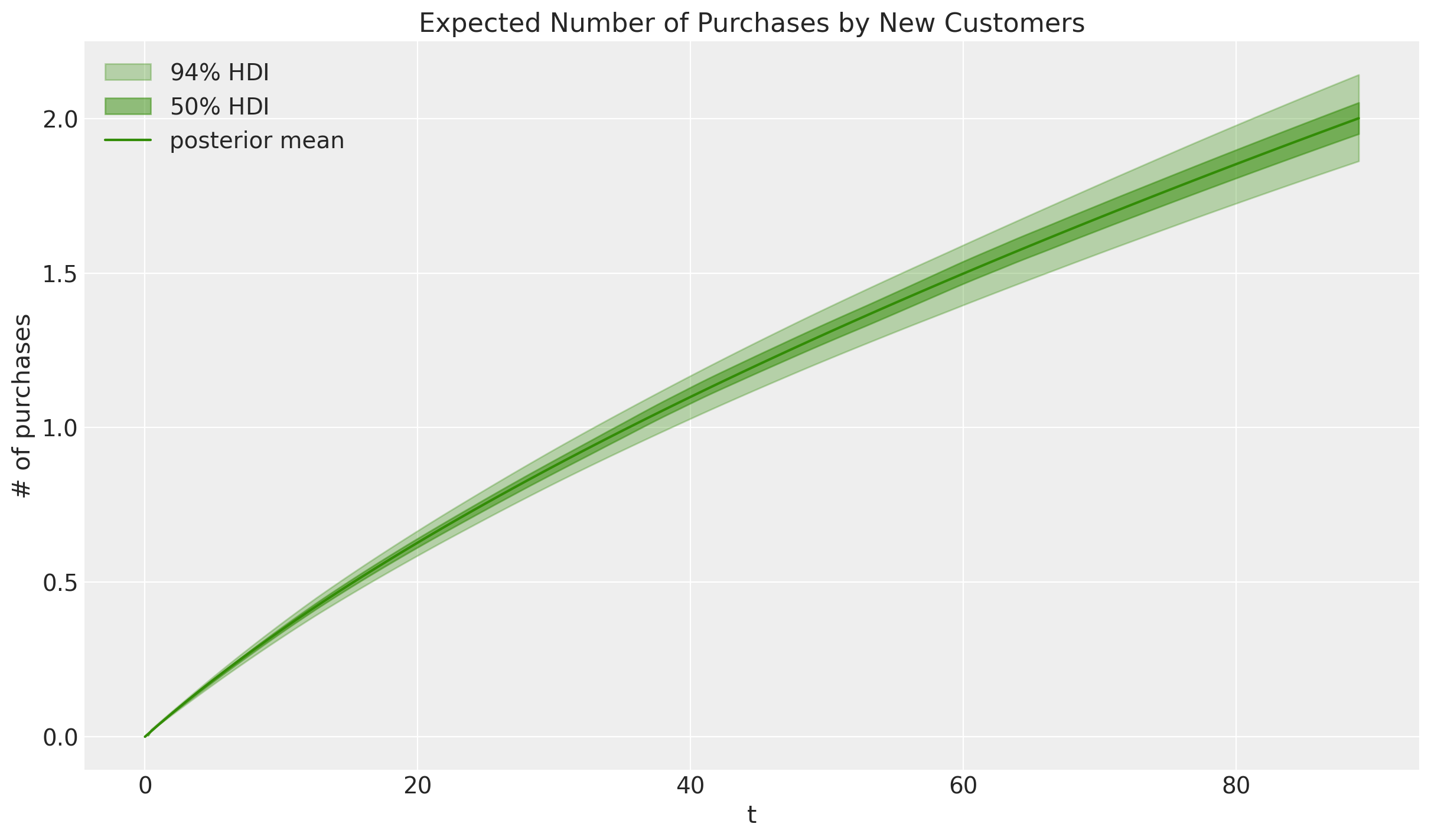 So far we’ve only been running predictions for existing customers, but we can also estimate the expected number of transactions over time for a new customer: