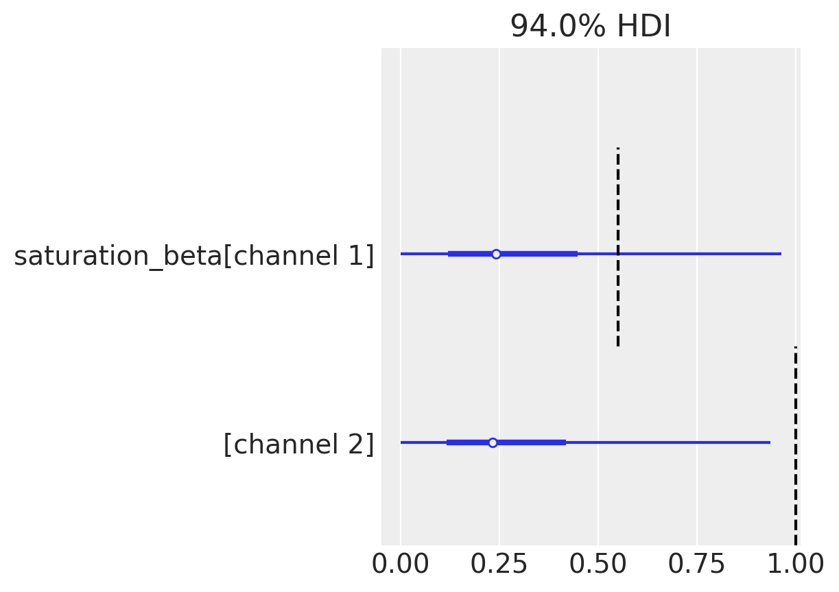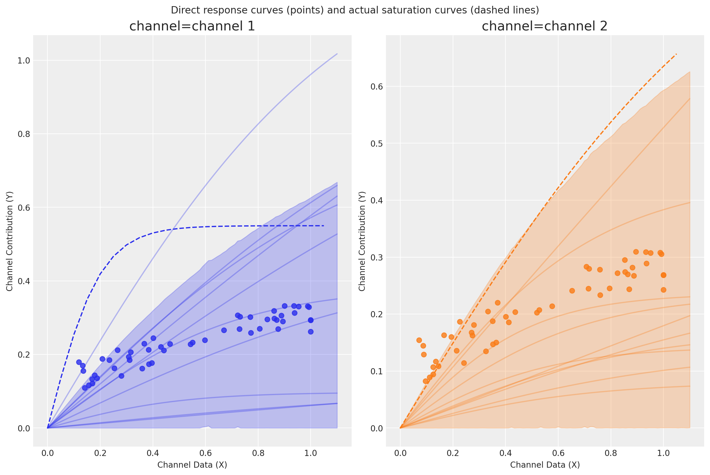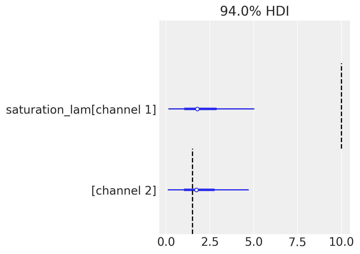 So we can see in the 2 plots above that when we add even more lift test data to our MMM, the parameter estimates relating to the saturation curves are getting closer to the true values.